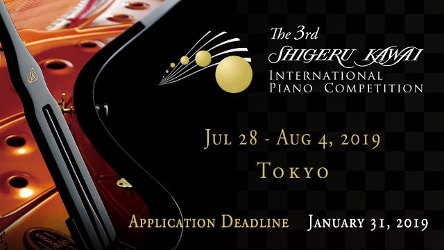 Now accepting applications for the 3rd Shigeru Kawai International Piano Competition (SKIPC). The competition will be held from July 28 to August 4, 2019 in Tokyo and pianists born between April 2, 1992 and April 1, 2002 are encouraged to apply. The deadline for the online application is January 31, 2019 (Japan time). Postal applications are also accepted and will need to be postmarked the same date as the online application.